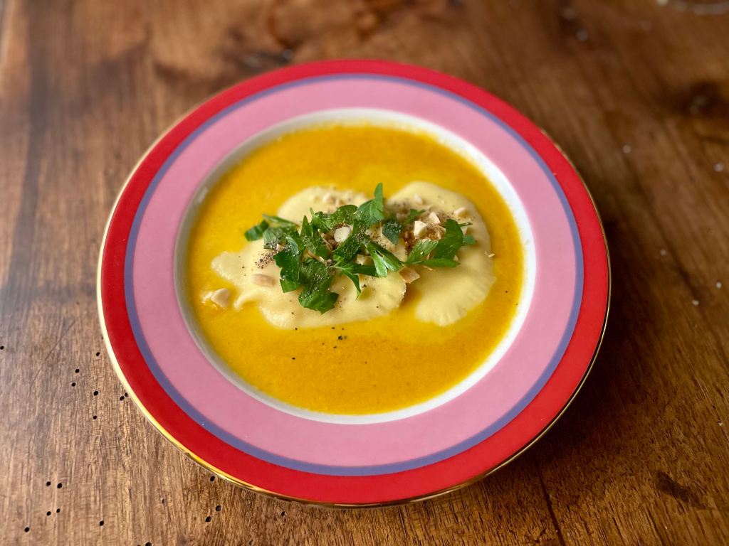 ravioli filled with egg yolk in a pumpkin-gorgonzola sauce with toasted almonds and parsley on top