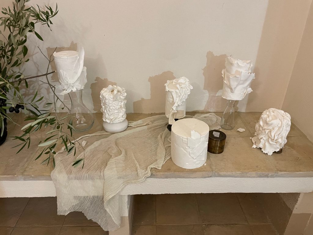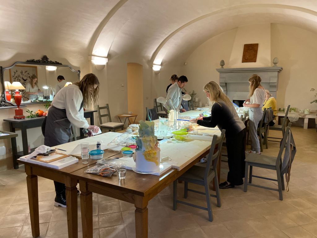 The retreat is based in a beautiful 400-year-old villa with a spacious garden. The rich landscape is used for outdoor sketching. One large room is dedicated to Jasmine’s instructions, and I am lucky to witness a workshop on wiring rice paper. On a long, wooden table I can spot edible colours, fondant, and a range of cake making tools. In the back of the room, the results of previous instruction lessons show the impressive creative energy of the group. The participants exchange their experiences with rice paper and begin exploring the material. Jasmine walks around and inquires into their decision-making. She tries to hone in on what part is interesting them most and help them recognise how their perspective is unique. The atmosphere of the room is cosy and intimate as the daylight is slowly giving way to the darkness outside.