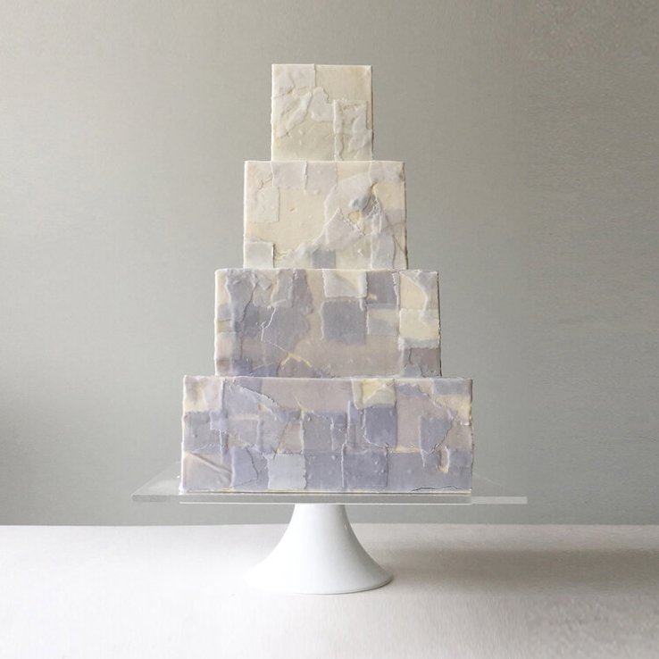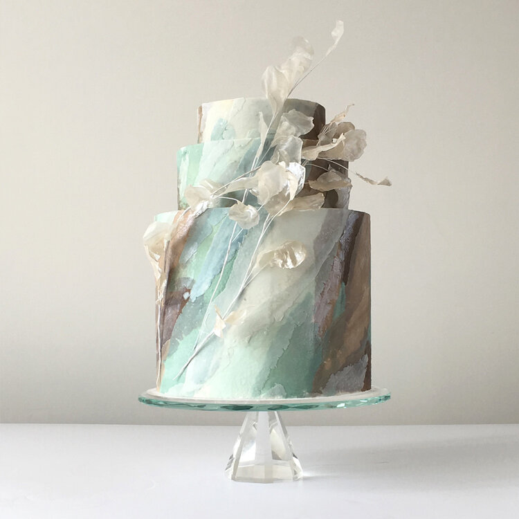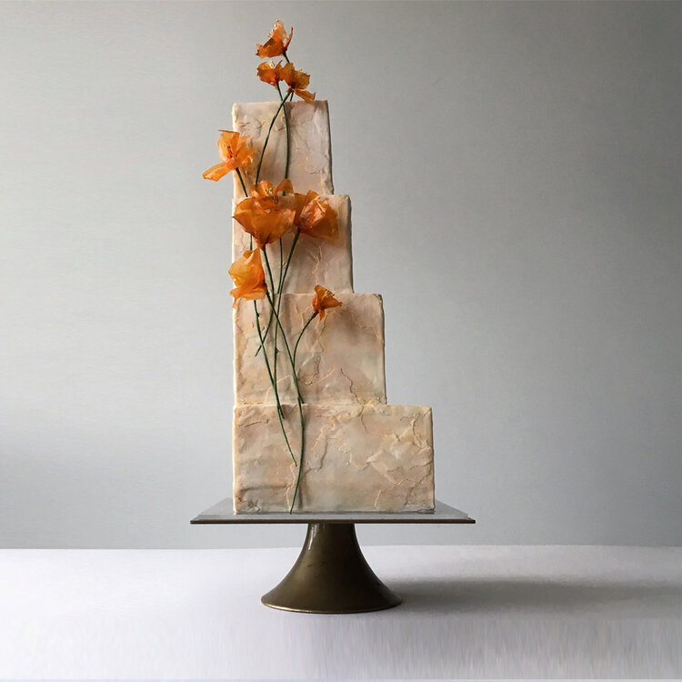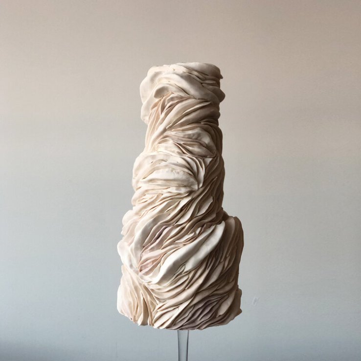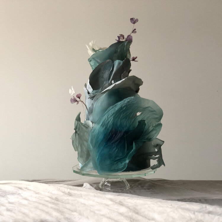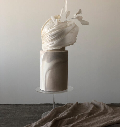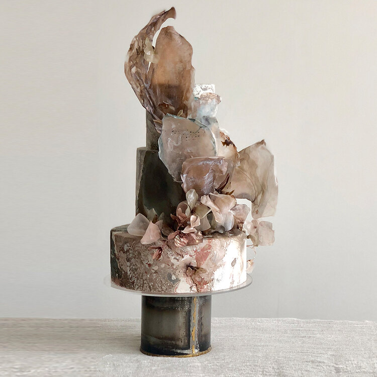 Jasmine’s design philosophy is based on what she calls the “natural process”. This process comes forward as she builds a relationship with her materials. She explores and facilitates the structures, textures, and surfaces that are inherent to a specific material and its exposure to different environments. Then, she allows the material’s characteristics to guide the final cake design: “all you can do is influence, but you can’t control the outcome of it, and so for me, that’s the natural process.” When she creates cake decorations with rice paper or uses the technique of fondant marbling, she bows down to the curves and folds that are forming. She then explores their potential to create movement or stillness for the overall composition. It is an approach based on acceptance and asking: “What did form? And saying, that’s really beautiful. I love this part right here that’s doing this. I’m going to pick this up and put that on a cake and if it starts to fall or melt in certain ways, how can I appreciate that and enjoy it or continue it? What lines did it form such that now I can start to bring the action in this direction and guide the eye around the cake in that way?” In this manner, Jasmine builds a “relationship with what is happening”.