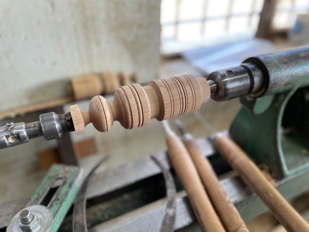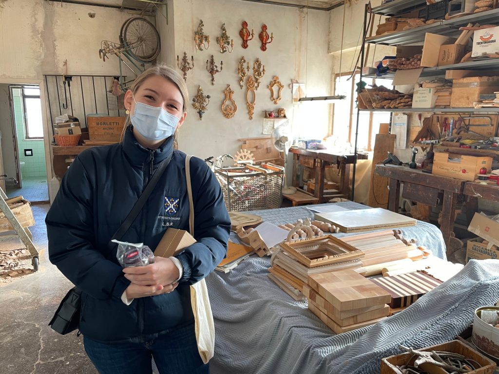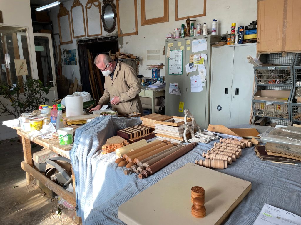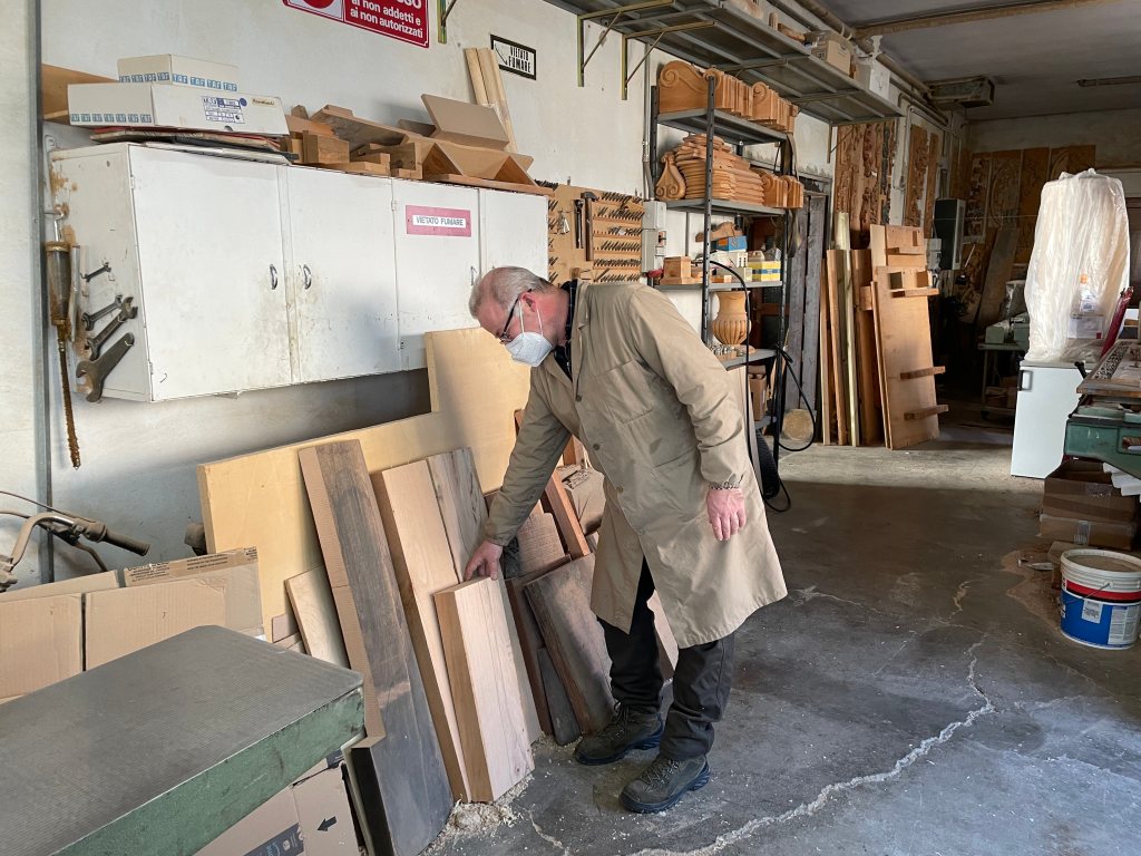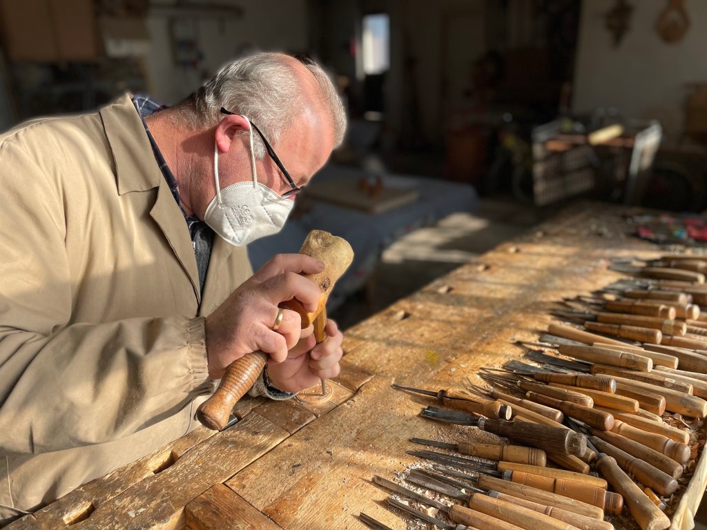In Tavarnelle Val di Pesa, a small town in the famous wine area Chianti, I park my car to visit the wood carving workshop of Filippo Romagnoli. From the outside, the building looks like a normal family house in a residential neighbourhood. The workshop is on the ground floor, and Filippo’s family lives above. When you enter the first room, you notice wooden frames and candelabra that hang on the workshop’s walls. Large shelves are packed with wood and carving projects in various stages. A big table stands in the middle of the room. On the table lay refined wooden rolling pines, beautiful cutting boards, and pasta stamps. The stamps are still waiting for their final finish. Bright sun beams illuminate the carving table on the right side of the room. It must carry about a hundred little carving tools from Italy, England, and Germany, among other places. The producers of these specialised tools are small artisanal businesses as well. Next to the carving table stand two delightful little lemon trees that have found refuge inside from the colder winter days. The second room of Filippo’s workshop is filled with bigger tools that he uses for the initial carving stages of his wooden products. Planks of different types of woods are leaning on the wall, waiting to be transformed. The workshop’s atmosphere is calm, and warm wood dust flies peacefully through the air.