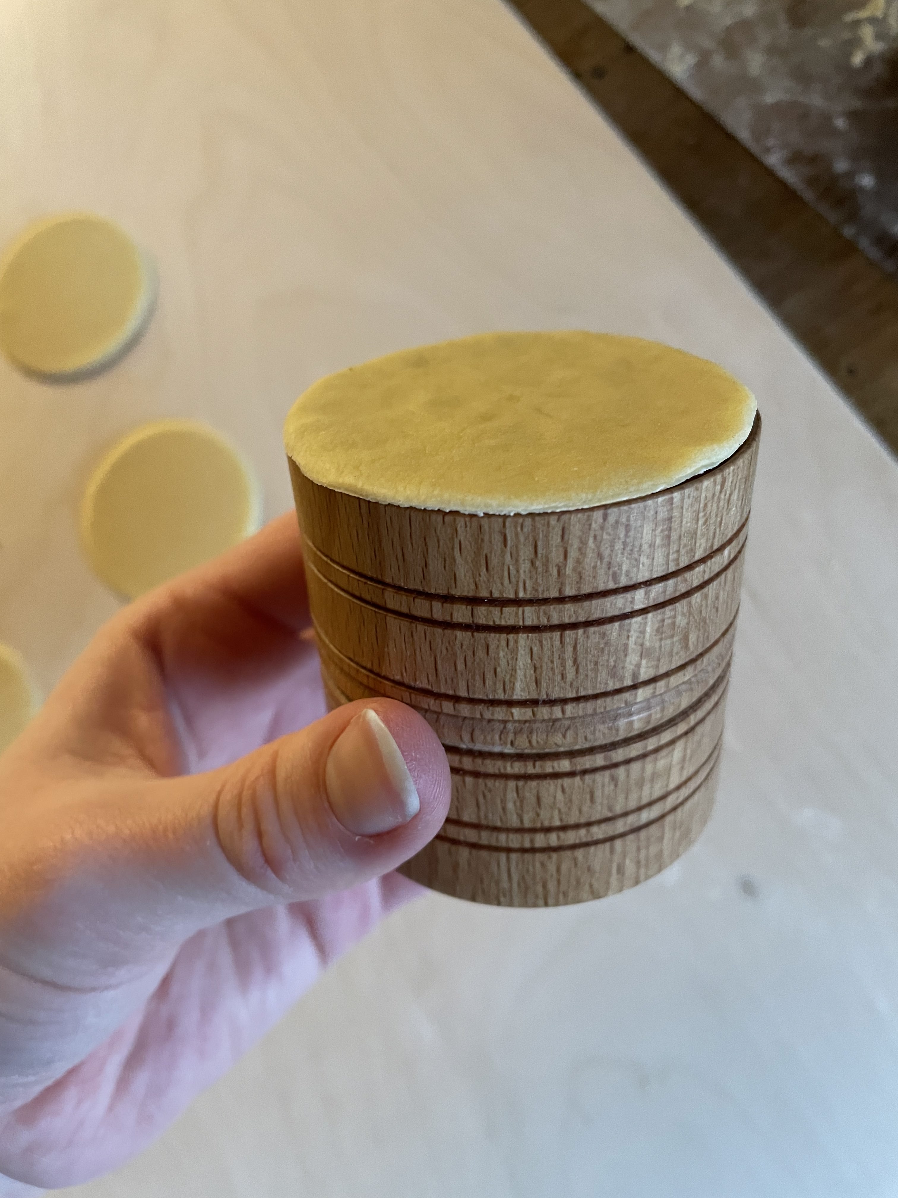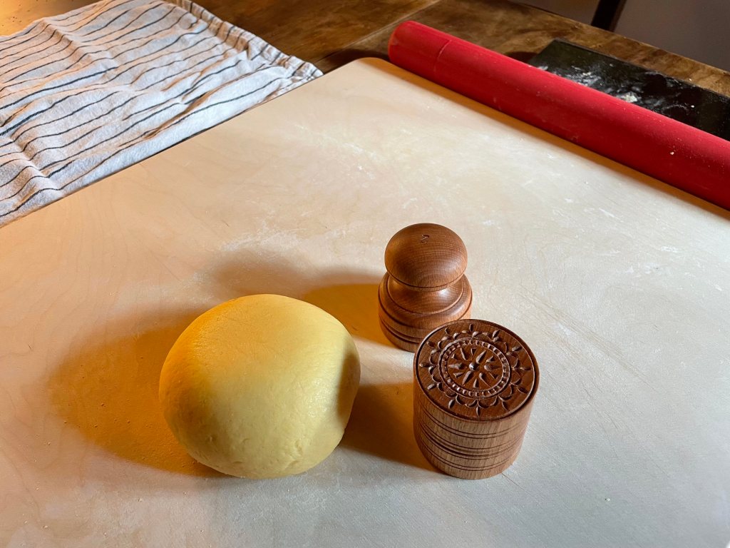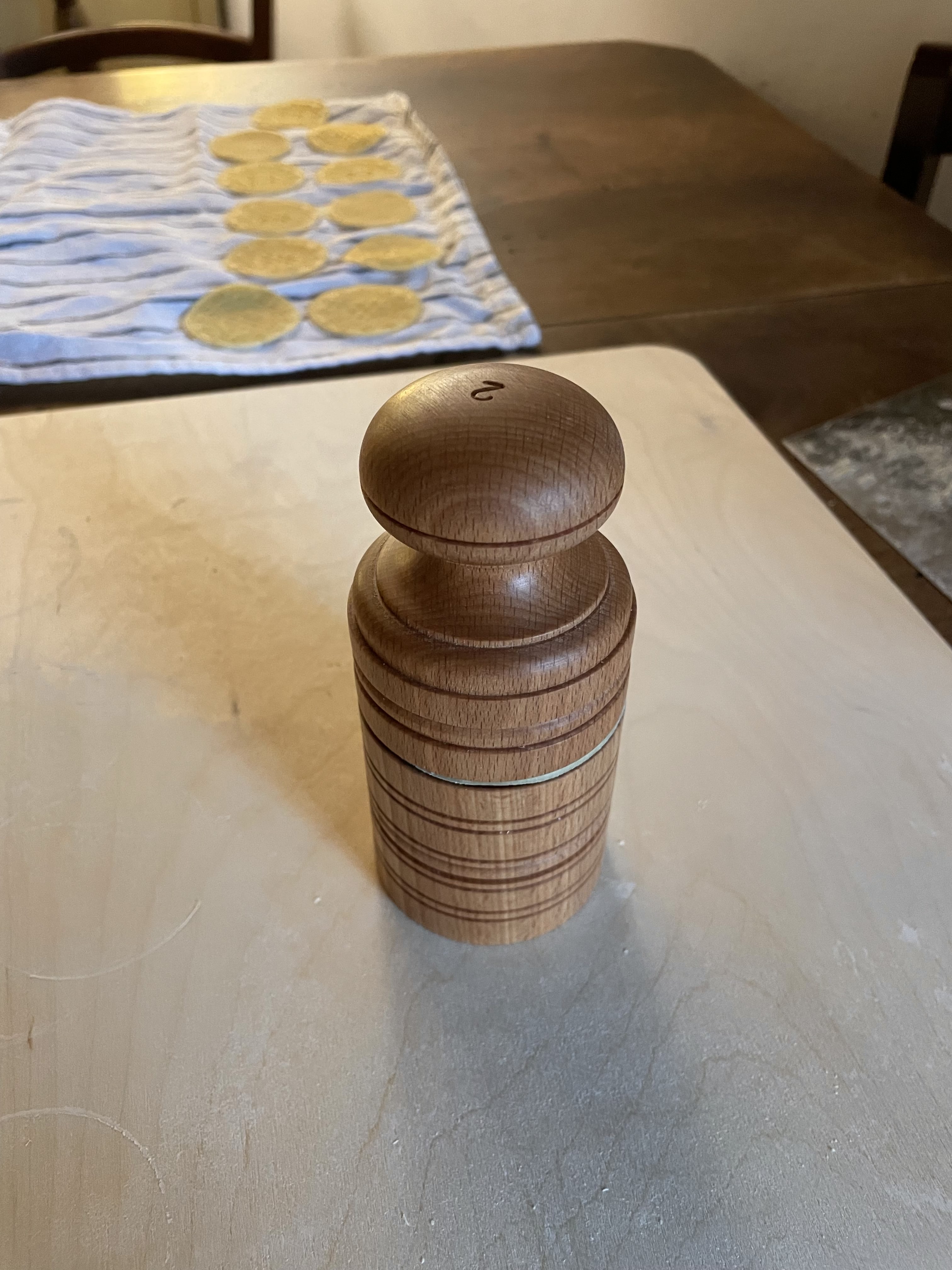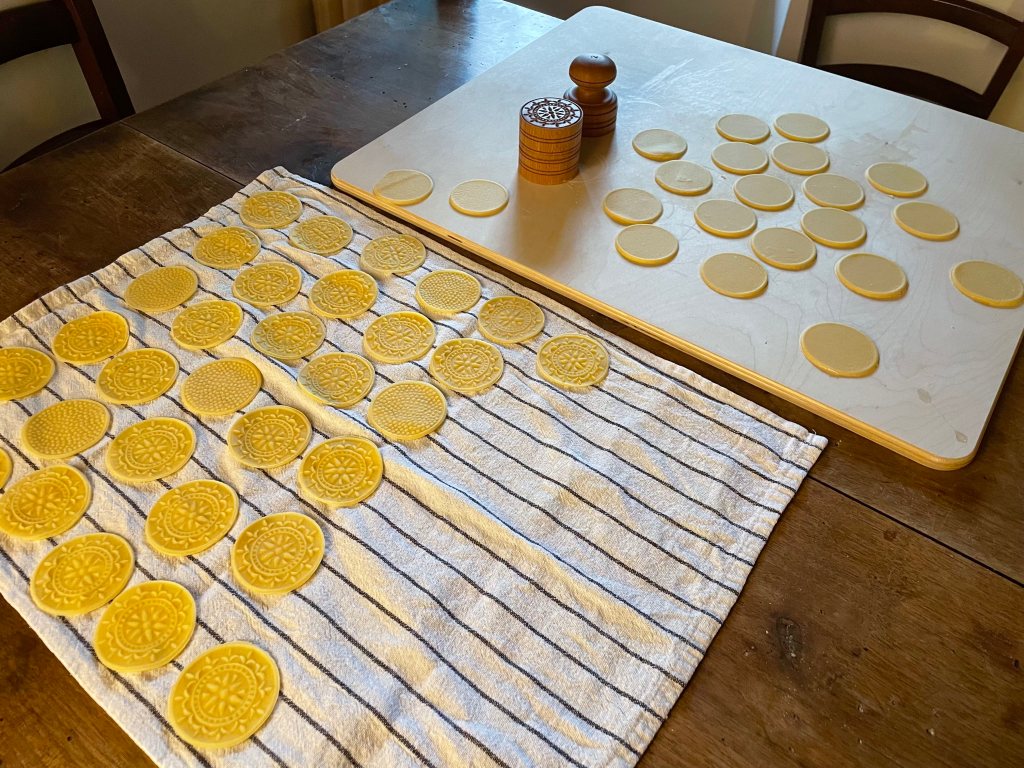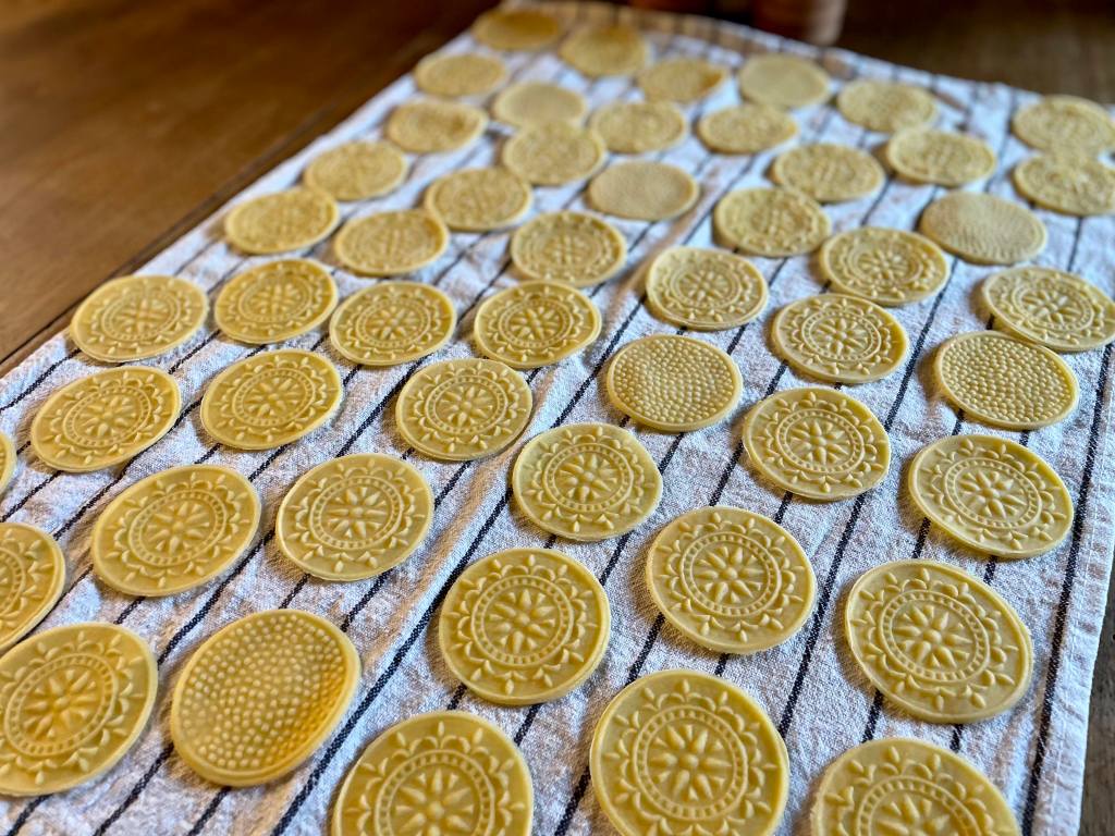 The Corzetti pasta stamp is a beautiful and very specialised kitchen tool. It consists of two parts. The lower part has a sharp edge to cut the rolled out pasta dough into round shapes. To create the decorations on the Corzetti, the round pasta disc is pressed between the two parts that have engraving imprints. Filippo carves the Corzetti stamps out of beechwood from the Casentino forest between Florence and Arezzo. The Casentino forest is a stony territory. The wood grows slowly, rendering it very solid. One cubic metre of Casentino beech wood weighs about 1200kg, making it much heavier than, e.g., beech wood from the German Black Forest. The high density is particularly important to stabilise the stamp’s cutting edge which is its most fragile part. The wood’s sturdiness is also essential to maintain the shape of the imprint. Filippo’s pasta stamps come with a range of different motifs; the Florentine lily, the bee, and an octopus, among others. Customers can also contact him for individualised designs.
